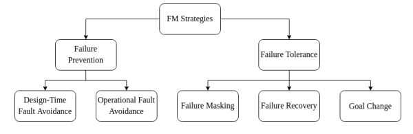 NASA的FM手册将FM策略细分为两种方法:预防和容忍[19]。预防策略是为了完全避免故障,而容忍策略则是为了在出现故障的情况下使任务能够继续。预防可以进一步分为设计时预防和运行时预防。设计时的预防是指将故障发生的可能性最小化的工程实践。运行时预防的工作方式是首先对运行系统进行预测,然后采取预防措施,避免任何预期的故障。容忍策略可分为掩蔽、恢复和目标改变方法。掩蔽方法试图通过防止故障在系统功能中进一步传播来最小化故障的影响。掩蔽的例子包括冗余和纠错,它们允许故障发生,但通过在故障传播之前对其进行修正,将其 "隐藏 "在系统的其他部分。恢复方法寻求诊断故障的根本原因和位置,并随后采取行动恢复系统的正常运行。这个过程通常被称为故障检测、隔离(定位)和恢复/响应(FDIR)。最后,目标改变方法通过修改任务目标来应对故障,以适应故障造成的系统能力的任何变化。
