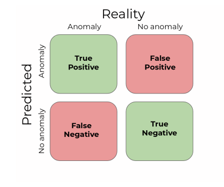 为了确保完整和客观的评估,需要谨慎地选择指标。异常检测问题所固有的典型的类不平衡意味着许多传统的衡量标准,如准确度、F-Measure、平均精度(AVPR)和接收运行特征曲线下面积(AUROC)可能会人为地夸大性能[63]。这方面的一个例子是二进制准确度;一个二进制分类器如果天真地将给定数据集中的每一个样本都归入名义类,那么由于类的不平衡度很高,它的得分可能会相对较高[64]。使用二元的真-假-正-负(TFPN)指标--真阳性(TP)、真阴性(TN)、假阳性(FP)和假阴性(FN)--作为评价的基础是很常见的,因为它们可以用来计算众多的其他衍生指标。混淆矩阵是使用TFPN指标来描述整体性能的一种常见方式,既直观又数字。异常检测混淆矩阵的布局示例如图15所示。给定评估数据集中的每个样本都被分配到四个象限中的一个,每个象限的总数被用来确定性能。文献中的普遍共识是,虽然一些数值如Matthews相关系数比其他数值更客观,但没有一个从TFPN指标中得出的单一数量能够完整和客观地描述。在比较可能具有不同统计质量的数据集的结果时,必须要有额外的考虑。一般来说,只有在可以明确量化并在分析中指出其偏差的情况下,才可以使用具有已知偏差的指标。关于两类分类指标及其相关优缺点的深入讨论,见[63-66]。