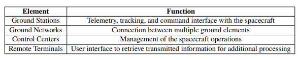 地面段的主要责任是与空间段对接,并在整个系统的其他部分分发各种类型的数据。一个典型的地面部分由几个元素组成,包括任务控制中心或任务运行中心、地面站、地面网络和远程基础设施。图5给出了典型的地面部分组件的概述。地面部分与空间和发射部分接口,并在发射后从发射控制中心接管对任务的控制。表1[17]中给出了各部分的主要功能。地面部分的主要运行作用是促进与空间部分的通信,允许数据与航天器上行连接和下行连接。任何没有在航天器上实现的空间段功能必须由地面段通过指挥和控制通信进行监测和执行。传输到地面的数据类型包括任务数据、遥测或内务数据,以及跟踪数据。通常情况下,传输到航天器的数据是指挥和控制数据。遥测和跟踪数据被任务操作员用来执行各种内务活动,如轨道计算和维护、任务规划和航天器健康评估[17]。