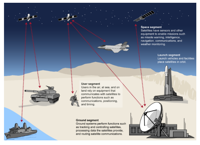 图3-典型的空间系统部分[16]。在运行上(即发射后),三个相关部分是地面、空间和用户部分。