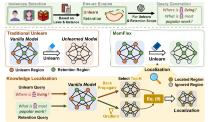 MemFlex方法受到知识编辑中的知识定位以及利用梯度信息提高定位精度相关研究的启发。其核心是通过分析梯度信息来确定模型参数空间中的擦除范围(Unlearn Scope)和保留范围(Retention Scope),然后在擦除阶段仅对擦除范围内的参数进行更新。以下是具体步骤: