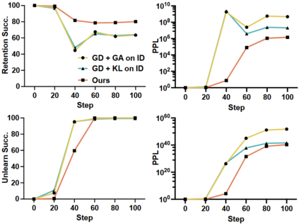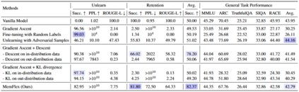 实验结果表明,在用户隐私领域,GA和随机标签微调虽能擦除敏感知识却未能保留通用知识,对抗样本擦除方法虽保持通用知识和低困惑度,但没有很好擦除敏感知识,梯度上升和下降组合方法在区分范围和通用任务性能上有一定表现,MemFlex在保留知识方面取得最佳平衡;在效率方面,MemFlex通过在擦除范围内更新参数提高了擦除性能和效率。