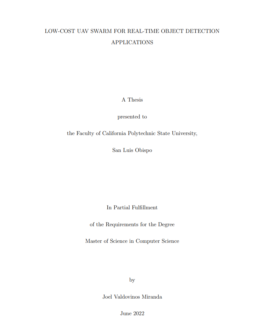 随着无人驾驶飞行器(UAVs),也被称为无人机,变得容易获得和负担得起,这些设备的应用已经大大增加。其中一种应用是使用无人机飞越大面积区域并探测所需实体。例如,一群无人机可以探测海洋表面附近的海洋生物,并向用户提供发现的动物的位置和类型。然而,即使无人机技术的成本降低,由于使用内置先进功能的定制硬件,这种应用的成本也很高。因此,本论文的重点是编制一个容易定制的、低成本的无人机设计,并配备必要的硬件,以实现自主行为、蜂群协调和机载物体探测能力。此外,本论文概述了必要的网络结构,以处理无人机群的互连和带宽要求。