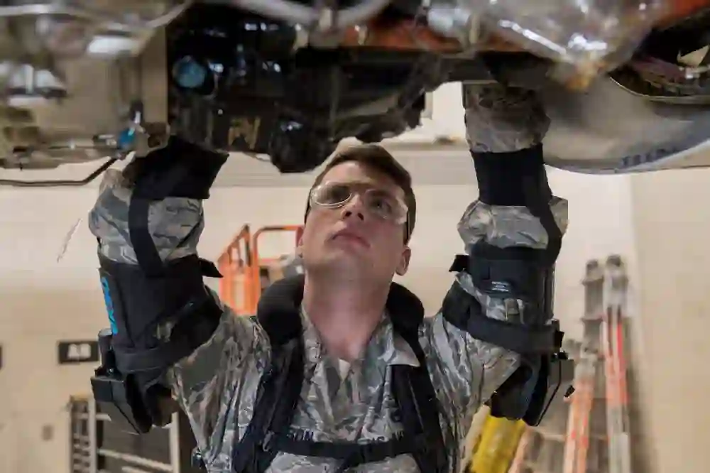 图:2019年2月26日,美国加利福尼亚州罗宾斯空军基地,美国空军第461航空控制联队的飞机电气环境技术员克里斯蒂安-沃森(Christian Watson)上士在对一架E-8C Joint STARS进行维护时演示了外骨骼背心的使用。外骨骼背心是一种创新做法的一部分,可在维护人员长时间高空作业时缓解肌肉压力。