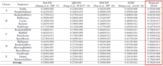 考率到转码压缩视频中存在的伪影是多次编码失真的叠加,先前的处理方案主要针对单次压缩损伤的修复,如图3所示,当其应用于转码视频上效果大打折扣。为此,结合实际应用场景,该论文将深度学习与转码视频去伪影任务相结合,利用转码视频特性,将初始编码信息作为中间辅助监督标签,设计辅助监督和全局监督损失函数引导网络训练。同时,该论文结合视频的时空相关特性设计了包括时域可变形对齐模块(TDAM)、金字塔空域融合模块(PSFM)等在内的卷积神经网络架构,并协同辅助监督(ASAM)和全局监督(GSAM)训练以更好地提升转码视频的画面质量,对应网络架构图见图4。因此,通过论文方法,可以在不增加视频码率的情况下大幅提高视频图像质量。表1以图像客观评价指标PSNR/SSIM增益作为客观评价指标衡量该论文方法较先前方法而言的增强性能提升程度。从