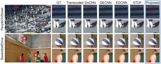 表中可以看出,该论文提出的方法在测试视频序列的平均PSNR增益为0.782dB,相比于先前方法STDF而言提升增幅达52.4%。同时,图5为与先前单次编码修复增强方法的主观效果对比图,可以看出该论文方案主观质量大幅提升,如转码损伤的斑马线被修复还原,行人周围的伪影得到大面积移除,篮球的边缘纹理修复重现等。因此,本论文无论从客观指标和主观效果上都极大程度地修复提升了视频转码压缩后的视觉质量。