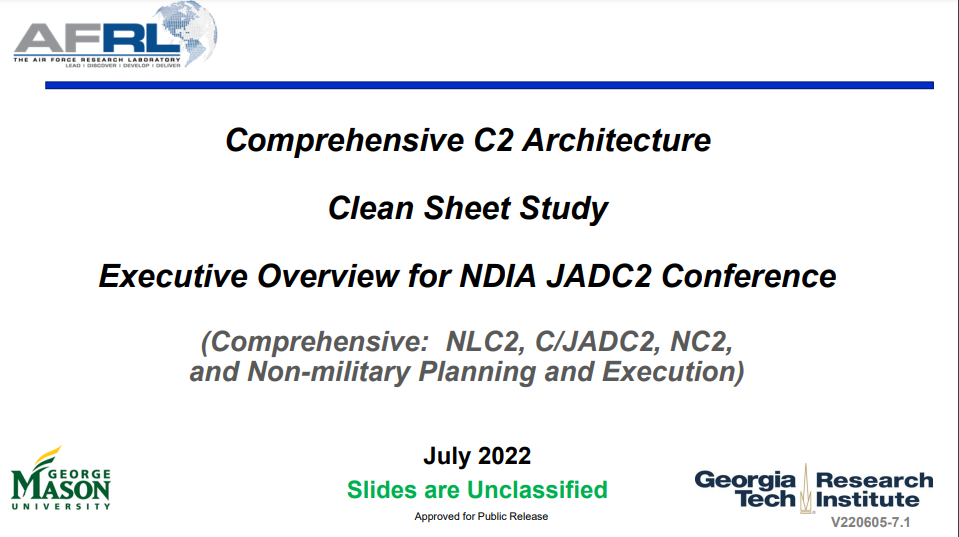 AFRL对其2017年的MD-C2 "Clean Sheet "进行后续研究,以制定一个综合的C/JADC2/C3-NC2/C3概念架构框架,然后以该框架为基础,为联合/全域C2(JADC2)/C3和国家C2/C3(包括核C2/C3)应用提出渐进的技术解决方案(名义上是向适用的ABMS和NC2项目办公室提出)。