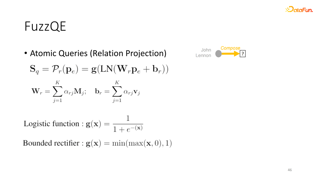 我们将每一个查询语句和对应的答案集合预设为Sq,也就是一个向量,其中的每一个元素被映射在零到一之间,从而方便进行fuzzy logic 的operation,而每一个实体是否属于其中某一个集合,我们可以表征为一个embedding和Sq之间相似度,也可以被表征为一个概率。