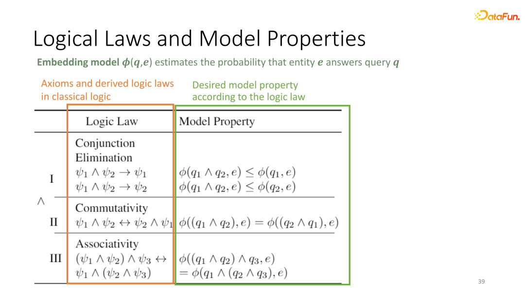 这部分我们不多展开,大家感兴趣的可以去看我们paper。简单来说就是我们根据一些logical law最基本的性质总结出了query embedding 需要符合的对应的一些性质。在这里总共有八条性质。