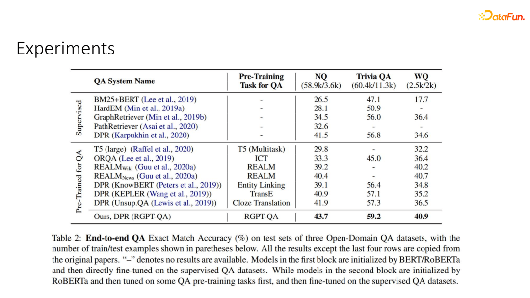 我们可以看一下最终的实验结果,除了和不预训练baseline进行比较以外,我们也和之前在QA问题上进行预训练工作包括T5、ORQA、REALM等进行了比较,我们可以发现在三个open domain QA data set中,基于RGPT-QA进行预训练的模型最终都能取得非常显著的提升。