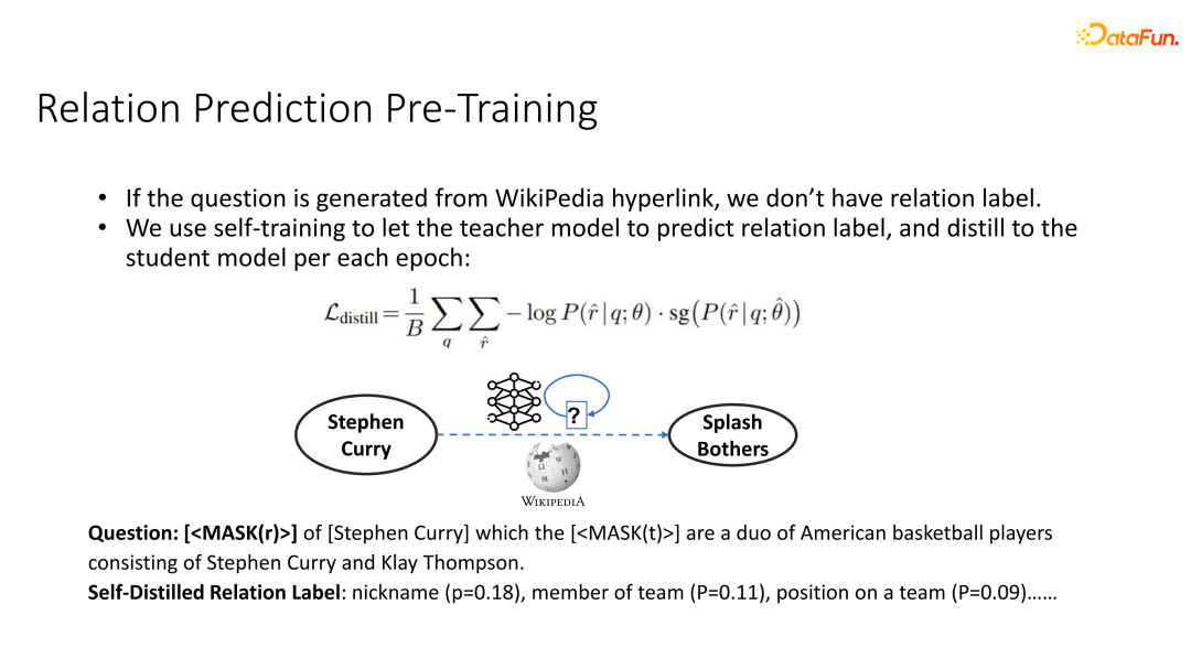 然而,如果说数据是从DPR模型中得到的,那么每一条边其实是一个hyperlink,我们并不知道它真实的relation是什么。对这一类数据我们利用了一个自学习self training的方式进行训练。在每一个epoch周期,我们使用上一轮的模型作为teacher model生成关系标签,并将其作为source label蒸馏到student 模型。