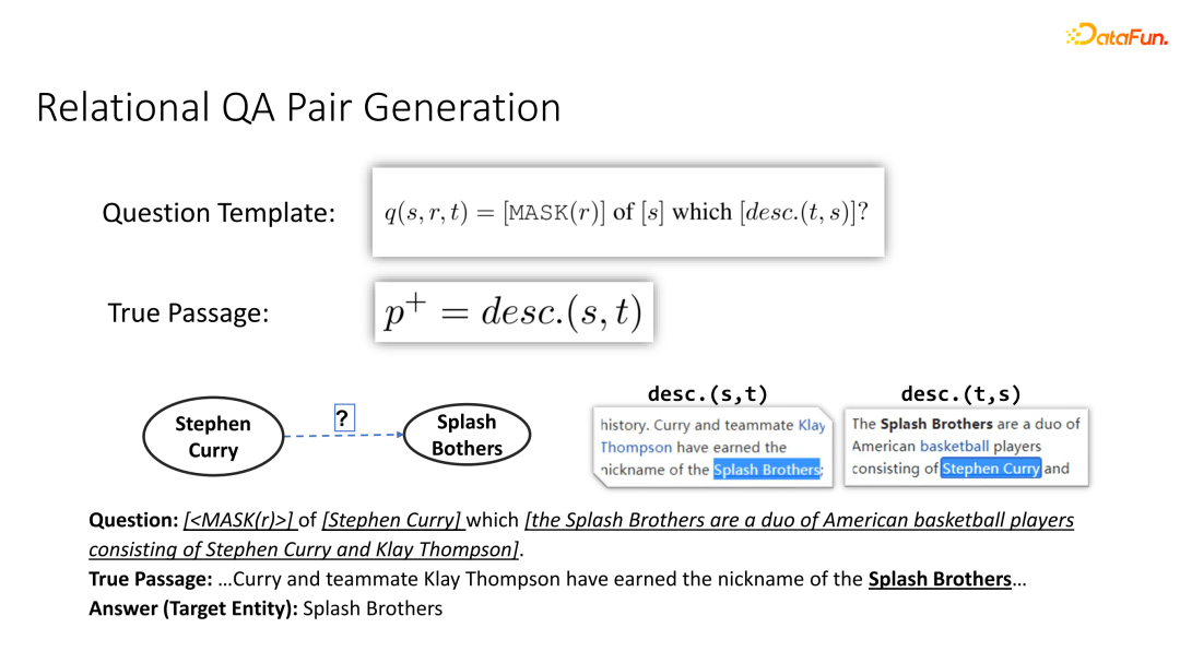 举个例子,当我们想要去生成关于Stephen Curry? Splash Bothers问题的时候,可以问出这么一个问题:[KASK(r)>] of [Stephen Curry] which [the Stephen Curry are a duo of American basketball players consisting of Stephen Curry and Klay Thompson],通过这个问题,我们希望模型能够识别出Stephen Curry以及目标Splash Bothers二者之间的relation,并且基于此找到答案Splash Bothers。