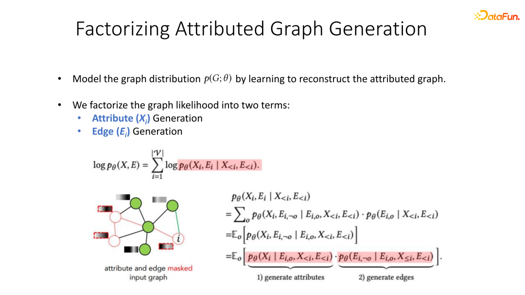 我们提出了一种介于中间的分解方式,引入了一部分已经观测到的边,假设在任何一个新的节点中,可能会有一部分边已经被观测到。比如说它本来有十条边,我们可能已经观察到其中的三条,然后将生存的概率分解成两部分:一部分是基于已经观测到的边来去预测它的attribute,第二部分是基于已观测到的边和attribute两部分预测剩余的一些连边信息。通过随机选取可能已经观测到的边,我们就能够获取每个节点的attribute以及它的连边之间的依赖。