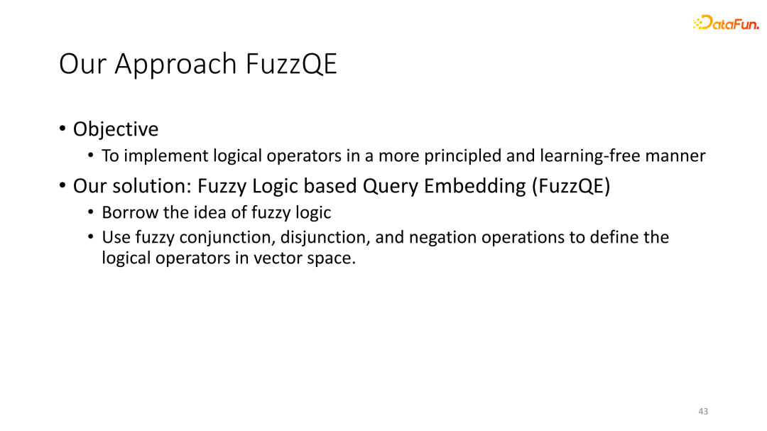 基于这一些challenge,我们提出了一个 fuzzy logic 新的 query embedding 模型。这一模型借鉴了 fuzzy logic 的基本操作来实现逻辑运算,且这些操作没有我们不需要的任何的额外参数,意思就是说我们再去进行逻辑运算的时候,我们是不需要额外的标注数据来进行学习的,只要模型的 entity embedding 和 relation prediction 足够好,就可以直接进行任何复杂逻辑推理。