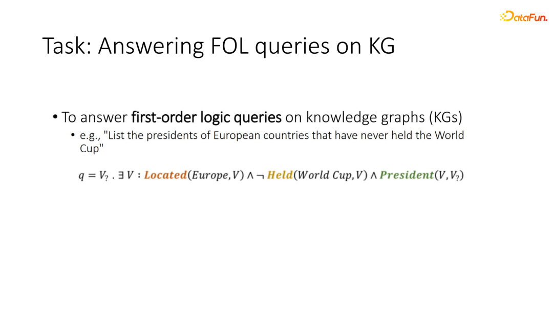我们想解决的问题是在知识图谱上进行一阶逻辑的推理。例如一个问题是:列出所有从未举办过奥运会的欧洲城市的总统。为了完成这一查询句,除了要准确地进行关系建模,也就是我们上一节工作想要处理的问题以外,模型还需要进行一些逻辑操作,例如与或非。