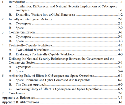 其中三个问题涉及:(a) 确定政府与商业部门在每个领域的国家安全关系;(b) 招募、专业发展和留住有技术能力的劳动力;(c) 在每个领域内部和两者之间实现统一行动,包括确定美国网络司令部(CCB)与美国太空总署(NASA)之间的适当关系。 这包括确定美国网络司令部(CYBERCOM)与国家安全局(NSA)之间、美国太空司令部(SPACECOM)与国家侦察局(NRO)之间以及美国网络司令部和太空司令部与地域和职能作战司令部(CCMDs)之间的适当关系。
