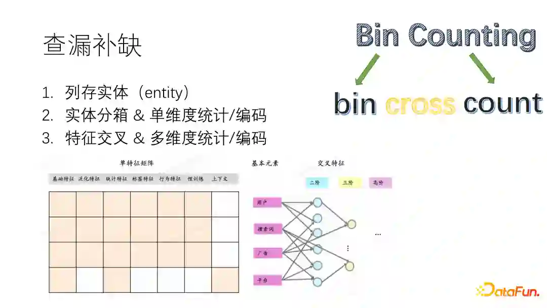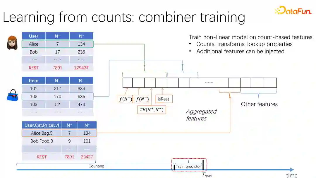 为防止出现特征穿越,各统计量的统计时间都要放在样本事件的业务时间之前,如上图时间轴所示,Train predictor阶段只能在其之前的Counting部分做统计计数。最终把各粒度的统计量特征变换后的值拼接为一整个特征向量。 **那么如何能把所有的特征都考虑到,做到不重不漏呢?**可以按照如下描述的结构化方法来枚举特征: * 列存实体。推荐场景的实体主要是用户、商品和上下文;广告场景的实体主要是用户、广告、搜索词和广告平台。 * 实体分箱。可以针对用户或物品的自然属性来分箱,例如用户可以针对每一个用户画像做分箱,物品可以基于类目、价格等做分箱,得到单维度的特征,利用历史行为信息对单维度特征做统计、编码。 * 特征交叉。在实体分箱的基础上做特征交叉,得到二阶、三阶或更高阶特征。