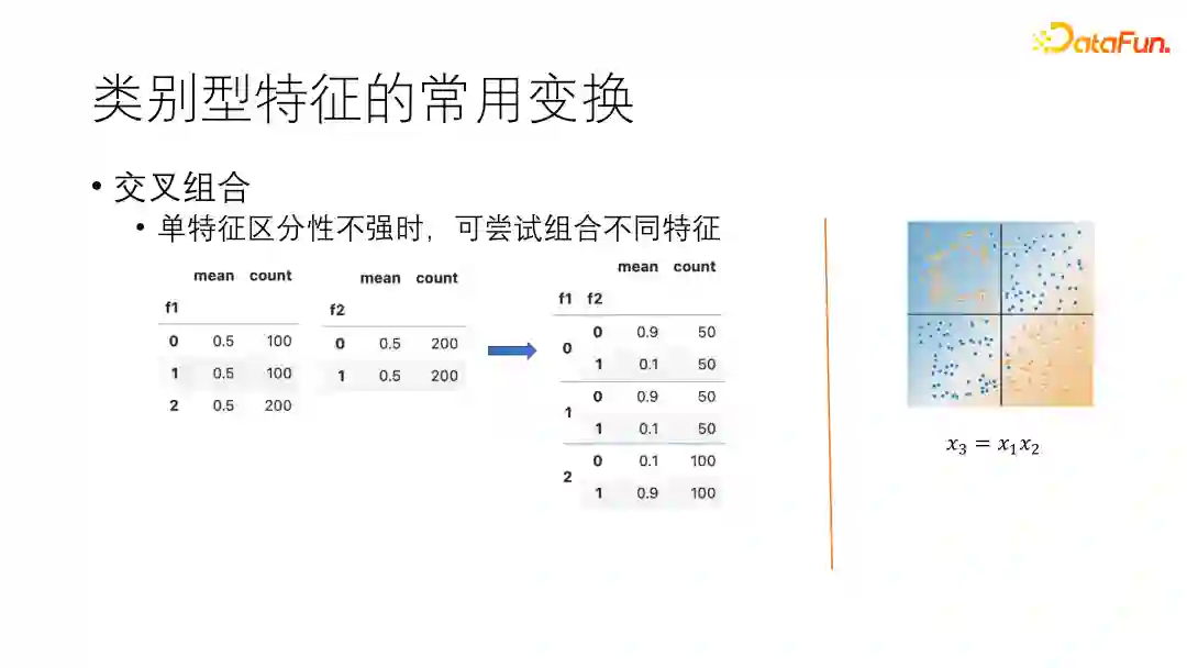 如上图,当特征f1和f2单独存在时都不具备很好的区分性,组合为一个整体就能够做出很好的预测。如上图右边的散点图,蓝色和黄色分别代表正负样本x1和x2,本身是线性不可分的,但我们引入一个特征组合x3=x1x2后就可以用sign(x3)来做预测。