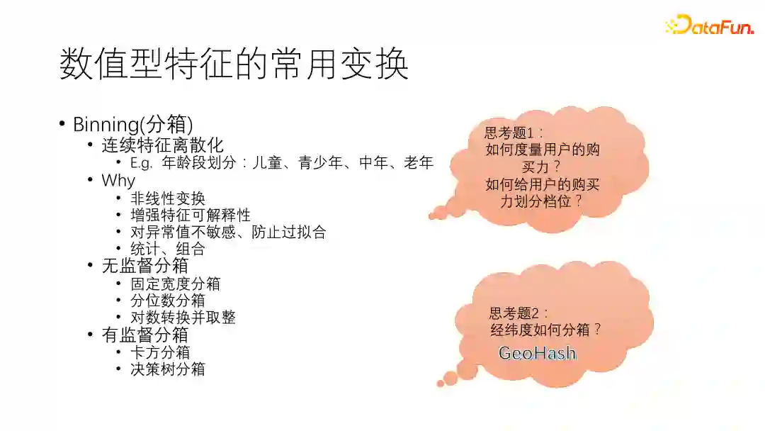 分箱有无监督和有监督两种方法。无监督方法包括固定宽度分箱、分位数分箱、对数转换并取整等,实际中应用较多,有监督的方法应用较少。下面再做两个思考题来说明一下分箱的具体应用: