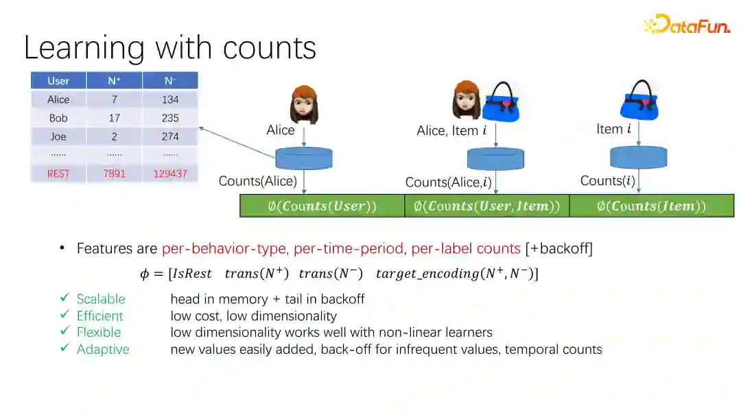 在统计正负样本数量之前,要先对推荐的实体(如用户、物品、上下文)进行分箱,称为bin counting,如上图所示。在得到用户和商品的分箱统计特征后,我们还可以对这些特征进行交叉组合得到新的统计量,称为cross counting,这些统计量最后都会转化为特征。