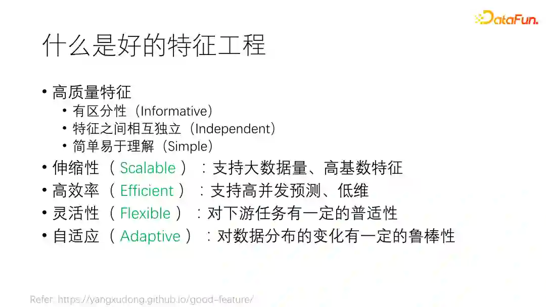 高质量的特征应具有区分度,相互独立,简单可解释性强等特点,对所有的机器学习任务都适用。 在推荐领域,我们对特征工程有一些其他要求。首先特征工程的伸缩性要强,支持高基数特征,支持大数据场景下的推荐任务;其次特征的设计还要让模型在线预测的时候支持高并发度,预测效率高;并且特征的设计要具有灵活性,一个好的特征工程应该适用于多个模型任务;最后也是最重要的,特征工程要对数据分布变化有一定的鲁棒性,因为在真实的场景中,数据分布变化在某种程度上来说是难以避免的,比如电商场景下经常会有些大促活动,这些活动的举办就会对数据分布产生影响,能够适应这种变化的特征才称之为一个好特征。