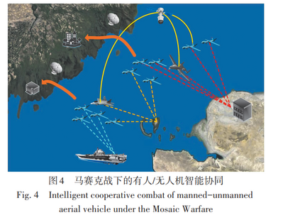 摘 要 为提高空战效能,以马赛克战为指导,研究复杂战场环境下的有人/无人机智能协同作战模式。介绍了有人/无人机协 同作战的研究现状以及传统有人/无人机协同作战的编队特点。在此基础之上,引入马赛克战思想,设计了基于马赛克战的有 人/无人机智能协同作战模型,对所提智能协同作战模型进行了可行性分析并描述了协同细节;分别从灵活性、决策能力、战争 成本、杀伤效力和安全性等方面分析其作战优势;从 6个方面总结了智能协同作战模式所需关键技术。 关键词 协同作战,马赛克战,无人机,人工智能,杀伤链!