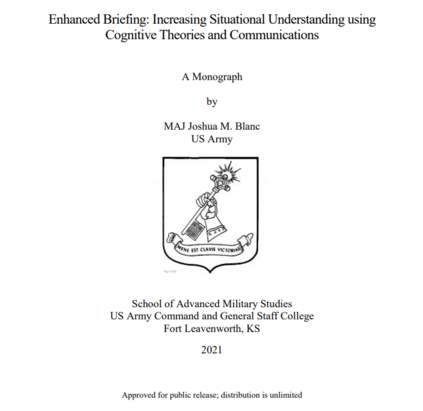 由于作战环境(OE)中的信息量过大,导致多域作战 (MDO) 的美国陆军指挥官无法快速做出决策。此外,美国陆军的演示方法缺乏正确展示和交流信息的能力,无法实现快速消费和高效决策。情报专业人员作为了解态势的信息提供者和关键决策的连通渠道,起着至关重要的作用。情报专业人员可以通过了解认知理论和交流来提高他们的能力,为指挥官和组织提供关键优势。本课题从三个重点领域入手,即学说、认知理论和交流。对理论进行了评估,形成对指挥官、参谋部和情报专业人员角色内核的理解。我们还研究了知识管理的演变,以建立态势认知,作战流程,以及交流和军事简报中的理论缺陷。这部专著涉及认知理论,包括:思维、学习、学习误区、双重编码理论、认知负荷理论和自然决策理论。交流方面的研究包括:理论、过程和方法,以及关于修辞、信息背景、简洁、说服力和影响力、常用词汇和视觉表现元素等这些额外细节。情报专业人员了解认知理论和交流的意义,将通过有影响力的信息传递促进学习的提高。改善组织内的简报方法,使用口头和视觉演示,将进一步丰富对态势的理解,以便在日益复杂的多领域环境中做出更快、更有效的决策。