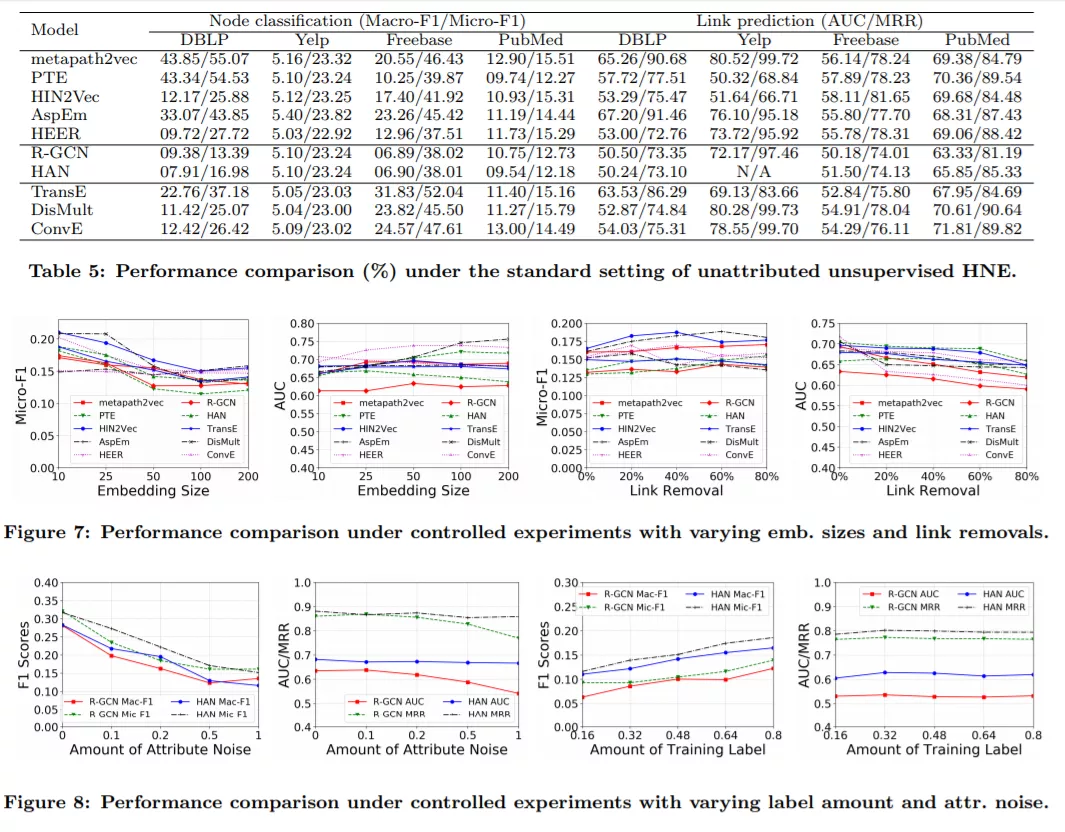 作为第三个贡献,许多现有的HNE算法(包括一些非常流行的算法)要么没有一个灵活的实现(例如,硬编码的节点和边缘类型、固定的元路径集等),要么不能扩展到更大的网络(例如,在训练期间的高内存需求),这给新的研究增加了很多负担(例如,,在正确的重新实现中需要大量的工程工作)。为此,我们选择了10种流行的HNE算法,在这些算法中,我们仔细地重构和扩展了原始作者的实现,并为我们准备好的数据集的插件输入应用了额外的接口(第5节)。基于这些易于使用和有效的实现,我们对算法进行了全面的经验评估,并报告了它们的基准性能。实证结果在提供了与第3节的概念分析相一致的不同模型的优点的同时,也为我们的基准平台的使用提供了范例,以供今后对HNE的研究参考。