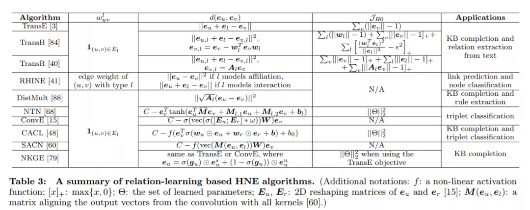 异类网络中的每条边都可以看作是一个三元组(u, l, v),由两个节点u, v∈v和一个边缘类型l∈TE(即。,实体和关系,用KG表示)。关系学习方法的目标是学习一个评分函数sl(u, v),该函数对任意三元组求值并输出一个标量来度量该三元组的可接受性。这种思想在KB嵌入中被广泛采用。由于已经有关于KB嵌入算法的调查[81],我们在这里只讨论最流行的方法,并强调它们与HNE的联系。