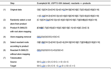 R-SMILES 在逆向反应的P2R阶段中,获得R-SMILES的流程如表1所示,其中包含以下主要步骤:(1)随机挑选一个带有原子映射的反应SMILES作为原始数据;(2)在生成物SMILES中随机挑选一个原子作为根原子,在表1中挑选了[Cl:8]作为根原子;(3)根据挑选的根原子,获得一个新的生成物SMILES(4)移除生成物SMILES中的原子映射信息。(5)从左往右遍历新的生成物SMILES的原子映射,如果该原子映射在某一个反应物分子的SMILES中出现,那么这个原子映射就作为该反应物SMILES的根原子。在表1中,[C:1]和[Cl:8]被选为两个反应物分子的根原子;(6)根据新的根原子,获得新的反应物SMILES;(7)将(4)和(6)中获得的反应物和生成物的SMILES进行字符划分,获得模型最终的输入和输出。逆向反应的P2S阶段的根对齐操作也与此类似。对于逆向反应的S2R阶段,作者将生成物和合成子拼凑在一起作为模型的输入。为了最小化输入和输出之间的编辑距离,作者将具有一一对应关系的合成子和反应物之间进行根对齐操作,而生成物则是向最大的合成子对齐。在正向反应的R2P阶段,作者将生成物向最大的反应物进行对齐。 表1. 在逆向合成的P2R阶段进行根对齐操作