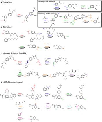 图4. 由R-SMILES训练的模型所提出的多步逆合成预测路径。
