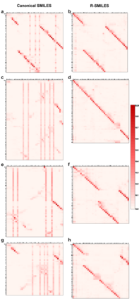 图2. 由canonical SMILES(左)和R-SMILES(右)所获得的注意力可视化。