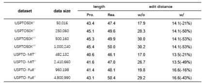 3 实验结果 使用R-SMILES后的编辑距离 表2. 有无根对齐下的编辑距离比较。Datasetxm::m为数据增强的倍数。Pro.:生成物SMILES。Rea.:反应物SMILES。