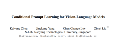 随着功能强大的预训练视觉语言模型(如CLIP)的兴起,研究如何使这些模型适应下游数据集变得非常必要。最近提出的一种名为上下文优化(CoOp)的方法将提示学习的概念引入视觉领域,以适应预训练的视觉语言模型。具体来说,CoOp将提示中的上下文单词转换为一组可学习的向量,并且仅使用少量标记的图像进行学习,可以在经过大量调整的手动提示中实现巨大的改进。在我们的研究中,我们确定了CoOp的一个关键问题: 学习的上下文不能泛化到同一数据集内更广泛的不可见类,这表明在训练期间观察到的CoOp基类过拟合。 为了解决这个问题,我们提出了条件上下文优化(CoCoOp),它通过进一步学习一个轻量级神经网络来为每幅图像生成一个输入条件标记(向量)来扩展CoCoOp。与CoOp的静态提示相比,我们的动态提示适应每个实例,因此对类迁移不那么敏感。大量的实验表明,对于不可见的类,CoCoOp的泛化效果要比CoOp好得多,甚至在单个数据集之外还显示出很好的可迁移性; 具有较强的域泛化性能。代码可在https://github.com/ KaiyangZhou/CoOp