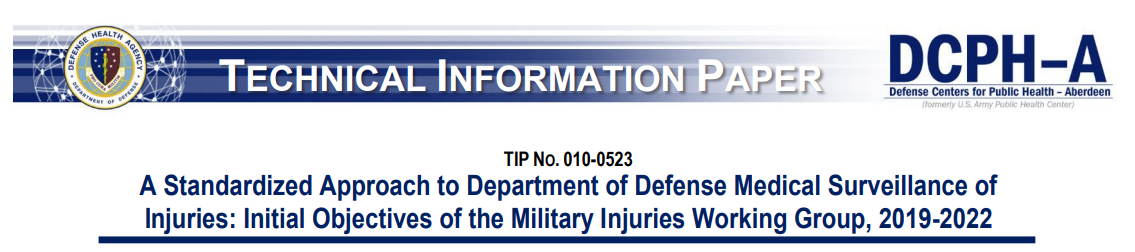 美国国防安全与监督委员会(DSOC)军事伤害工作组(MIWG)成立于 2019 年,其部分目标是建立统一的国防部(Department of Defense,DoD)伤害定义,创建标准化的医疗伤害监测报告工具,并探讨军种层面的伤害问题,以提出改进伤害报告的国防部解决方案。本文件反映了在美国陆军公共卫生中心 (APHC)(现名为国防公共卫生中心-阿伯丁 (DCPH-A))公共卫生科学家的主持下,MIWG 在 2019 至 2022 日历年间所做的初步努力。