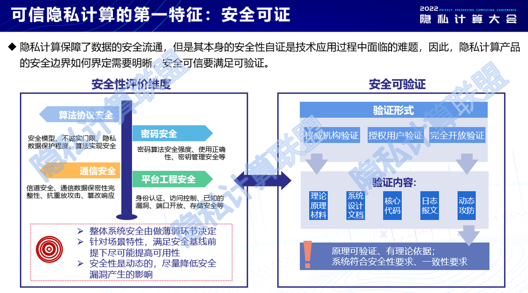 可信隐私计算的第一特征是安全可证。我们需要理清安全的维度是什么,验证安全的方式有哪些,验证的内容是什么。安全性评价维度方面,我们通过近两年来对各个细分隐私计算算法的安全性进行详细梳理,认为需要关注算法安全、密码安全、通信安全、系统安全、产品安全等内容。安全性验证方面,目前比较常见的验证形式有三种:第三方机构验证、授权用户验证和完全开放(开源)接受公众验证,然后通过原理材料、代码、日志报文及动态攻防等内容来验证系统满足原理可验证、符合一致性要求和安全性要求。