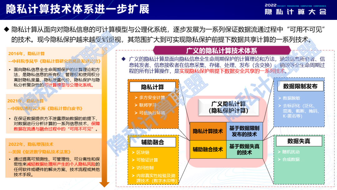 从2016年中科院的李风华等人提出隐私计算相关概念,到隐私计算联盟、中国信通院云大所去年发布的隐私计算白皮书(2021),以及近年来美国等国家纷纷提出隐私增强计算、隐私保护计算等概念,随着隐私计算的深入发展,其概念和理论扩展越来越丰富,越来越深化,也越来越广阔。因此,除了多方安全计算、联邦学习、可信执行环境三大主流方法外,数据限制发布类的、数据失真类的、区块链类的相关技术也应纳入广义隐私计算的范畴,实现隐私保护前提下数据安全共享的一系列技术都在广义隐私计算的范畴内。