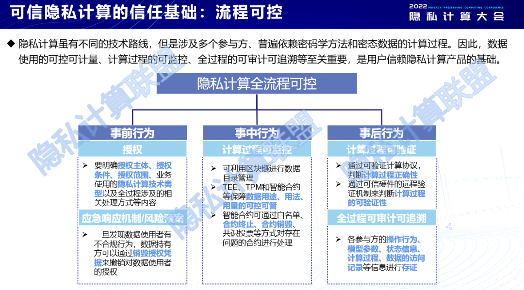 除了安全可证、隐私保护之外,隐私计算的信任基础是要做到全流程可控,包括事前授权,事中监控,事后审计等。事前要对人授权(谁来用),对数授权(数的范围、用法、用量、用途),对所有相关流程进行充分授权,并在确认授权之后再使用,这样才能达到事前可控的状态。同时还要保证授权在全流程中不被篡改,比如可以通过TEE、TPM或者智能合约等技术实现数据任务或者计算流程的防篡改。另外,事中要进行全流程监控实现数据使用的可控可计量,事后要可以通过相关方式,比如验证计算过程的正确性、通过日志存证等方式对计算的全过程操作行为、数据使用情况进行审计。