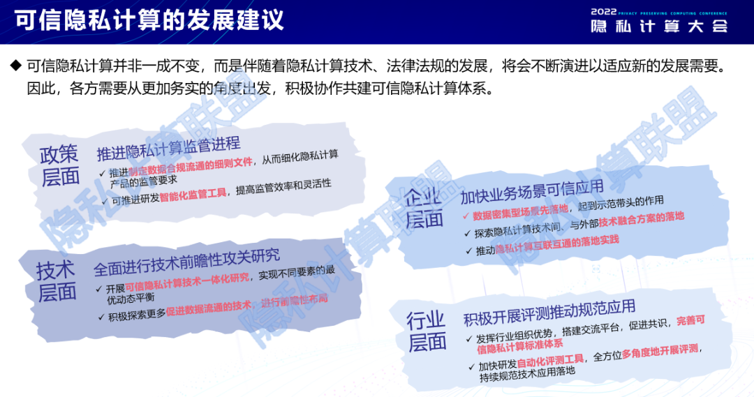 最后,我们提出几条相关的发展建议,希望各方能积极协作共建可信隐私计算体系。政策方面,加快推进监管进程,比如出台相关的法律法规和配套文件,细化监管要求。技术方面,全面加强基础性技术前瞻性攻关研究,当前技术还有很大提升空间,比如需要进一步提升它的安全性和可用性。企业方面,加快场景应用,推动试点示范。行业层面, 充分发挥行业组织优势,完善可信隐私计算标准体系和开展相关评测,持续规范技术应用落地。