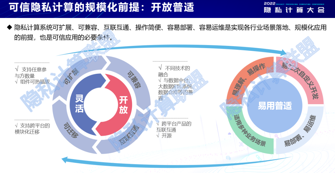 隐私计算产品需要更多灵活开放的能力,包括可扩展、可迁移、可兼容和互联互通。这是隐私计算应用时重要的基础,做到这一点未来会让隐私计算产品变得更加普适化,更加兼容,更有利于构建互联互通的生态。在产品普适方面,产品要做到用户容易理解、操作、部署和运维,具有可视化界面,方便用户二次自定义开发,从而适用多种业务场景,加速技术的应用落地。