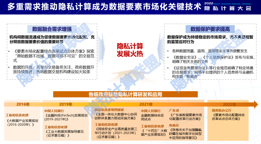 近年来,在政策驱动和市场需求同时作用下,隐私计算技术、产业、应用迅速发展。一方面,数据流通需求不断增强,机构间的数据流通成为促使数据要素市场化配置、充分释放数据要素价值的重要环节;另一方面,相继出台和实施的法律法规使得数据安全,特别是数据流通过程中的安全保护,成为持续稳定的市场需求,而不再是短暂的监管应对行为。同时,从2016年开始,多个政策纷纷出台鼓励隐私计算发展。