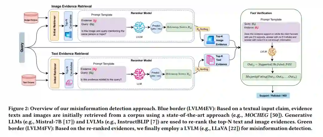 虚假信息的日益泛滥及其带来的严重影响,促使工业界和学术界开发虚假信息检测和事实核查的方法。近年来,虽然大型语言模型(LLMs)在各种任务中表现出色,但LLMs是否以及如何有助于虚假信息检测仍然相对未被充分探索。大多数现有的先进方法要么不考虑证据,仅关注与声明相关的特征,要么假定证据已经提供。少数方法将证据检索作为虚假信息检测的一部分,但依赖于微调模型。在本文中,我们研究了在零样本设置下使用LLMs进行虚假信息检测的潜力。我们将证据检索组件纳入流程,因为从各种来源收集相关信息以检测声明的真实性至关重要。为此,我们提出了一种新的使用LLMs和大型视觉语言模型(LVLM)的多模态证据检索重排序方法。检索到的证据样本(图像和文本)作为基于LVLM的多模态事实验证方法(LVLM4FV)的输入。为了实现公平评估,我们通过为现有证据检索数据集中的证据样本注释更完整的图像和文本检索证据样本,解决了证据样本的真值不完整问题。我们在两个数据集上的实验结果表明,所提出的方法在证据检索和事实验证任务中均表现优越,并且在跨数据集的泛化能力方面也优于有监督的基线。