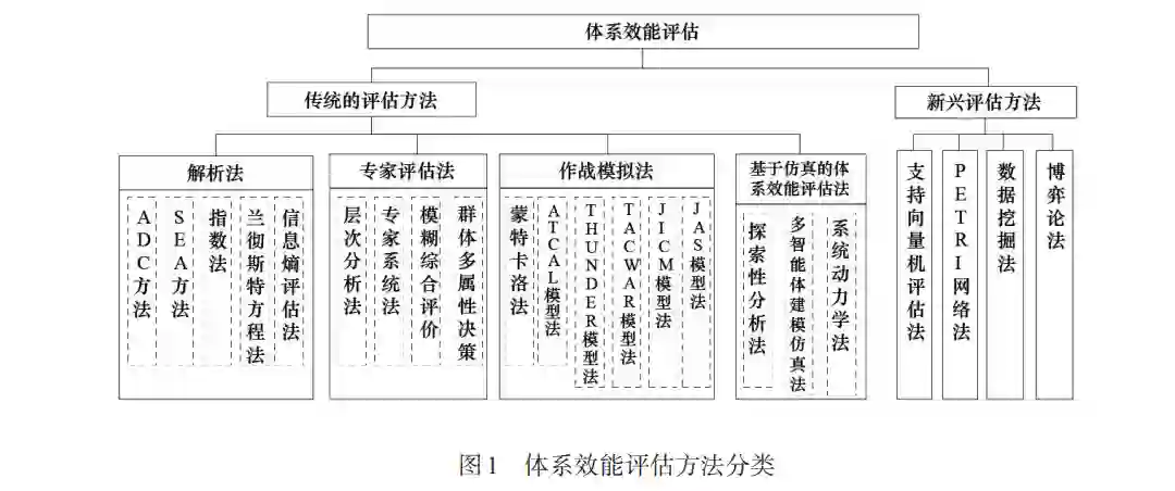 随着武器装备信息化进程的不断推进,面对联 合作战、跨域作战等复杂作战环境下体系对抗的任 务需求,最大限度地利用好分布在不同区域的信 息、火力平台以及跨兵种作战资源是联合制胜的关 键所在[1-4] 。因此在装备建设、资源规划、力量编 成、体系构建以及任务协同等规划与设计过程中, 就需要充分借助系统工程思想,通过计算、评估、模 拟、推演、仿真等手段对体系效能进行评估,确定出 影响体系效能发挥的薄弱环节,从而进行相应调整 以达到体系效能的最优化。同时,如何基于体系作 战效能进行装备编成、配置构建,如何根据在体系 中的定位牵引具体装备的性能指标,如何评价体系 配置、作战任务完成率、装备对体系的贡献率等,在 工业设计和装备应用中变得愈来愈重要[3, 5-9] 。然 而,由于体系组成复杂、各种影响因素交织,作战环 境的复杂性、多样性、瞬变性和难以预测性等对体 系建设和评估带来了极大的困难。因此,对现有的 各种体系效能评估方法进行梳理与总结,分析各方 法的优缺点以及在体系效能评估中的具体应用,进 而为体系效能评估策略的选择和设计提供依据是非常必要的。