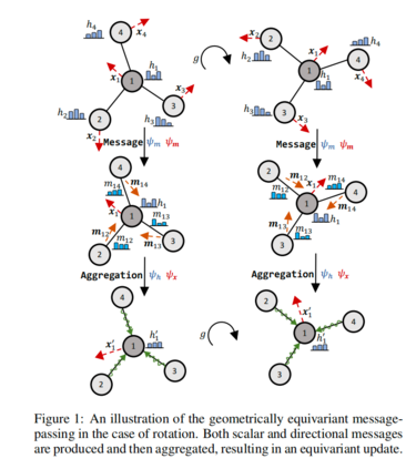 其中,和 分别表示沿边 进行消息传递的标量输出和矢量输出, 和 分别是标量特征和几何向量的消息聚合函数。下图详细说明了上述等变消息传递协议。
