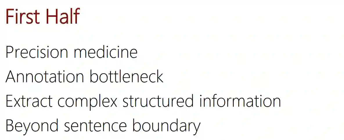 主讲嘉宾: Hoifung Poon,微软研究院(Microsoft Research)的Precision Health NLP主任,也是华盛顿大学医学院(University of Washington Medical School)的一名附属教员。他领导了汉诺威项目,其首要目标是通过将概率逻辑与深度学习相结合,提高机器阅读的精确度。他曾在计算语言学协会(ACL)和人工智能发展协会(AAAI)等顶级会议上就这一主题提供辅导。他的研究涵盖了机器学习和自然语言处理(NLP)中的广泛问题,他之前的工作获得了北美计算语言学协会(NAACL)、自然语言处理经验方法(EMNLP)等顶级机构颁发的最佳论文奖,以及人工智能的不确定性。他在华盛顿大学获得计算机科学和工程博士学位,专攻机器学习和NLP。等