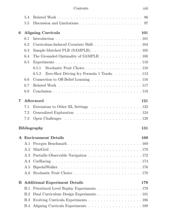深度强化学习(RL)为训练最优序列决策智能体提供了强大的方法。由于收集现实世界的交互可能带来额外的成本和安全风险,通常的模拟到现实(sim2real)范式是在模拟器中进行训练,随后在现实世界中部署。然而,RL智能体容易过拟合于选定的模拟训练环境,并且更糟的是,一旦智能体掌握了特定的模拟环境集合,学习就会结束。与此相反,现实世界是高度开放的——特征是不断演变的环境和挑战,使得这种RL方法不适用。仅在大量模拟环境空间中进行随机化是不够的,因为这需要做出任意的分布假设,随着设计空间的增长,抽样对于学习有用的特定环境实例的可能性组合上会变得越来越小。理想的学习过程应该自动调整训练环境,以最大化智能体在开放式任务空间中的学习潜力,该任务空间与现实世界的复杂性相匹配或超越。本论文开发了一类称为无监督环境设计(UED)的方法,旨在通过原则性的方法逐渐提高学习智能体的鲁棒性和通用性,从而启用这样一个开放式过程。在给定的潜在开放式环境设计空间中,UED自动生成一个无限序列或课程表的训练环境,这些环境位于学习智能体能力的前沿。通过广泛的实证研究和基于最小最大后悔决策理论和博弈论的理论论证,本论文的发现显示,UED自动课程可以产生显著提升鲁棒性和泛化能力的RL智能体,使其能够应对以前未见的环境实例。这样的自动课程是朝向开放式学习系统的有前途的路径,这种系统接近通用智能——这是人工智能研究长期追求的目标——通过不断生成并掌握自己设计的更多挑战。