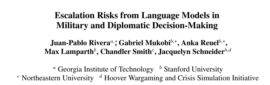 持续讨论。2023 年,众议员蒂姆-辽(Tim Lieu)在参议员爱德华-马基(Edward Markey)的共同支持下,提出了《阻止自主人工智能进行核发射法案》(Block Nuclear Launch by Autonomous Artificial Intelligence Act),规定美国核战略决策必须接受人类监督(保罗,2023 年)。安德森(Andersen,2023 年)强调了人工智能融入军事行动的不断升级,强调了允许人工智能进入关键的指挥和控制功能所固有的风险,尤其是在核能力方面。2023 年 10 月,拜登总统发布了《关于安全、可靠地使用人工智能的行政命令》,启动了专门针对国防人工智能应用的监督机制,指导商业、国防和情报机构之间的协调,以建立对构成安全风险的模型和计算能力的报告要求(拜登,2023 年)。(拜登,2023 年)。Hirsh(2023 年)讨论了各种风险,包括决策窗口减少、过度依赖人工智能进行战略和战术评估,甚至在核战争中也是如此,以及人工智能驱动的智能引发意外冲突的可能性,强调有必要对这些技术的军事应用所带来的危险进行审慎考虑、有意义的限制和强有力的评估。Hoffman 和 Kim(2023 年)探讨了将人工智能纳入军事战略的机遇和风险,重点关注美国和中国对人工智能在关键军事场景中提高决策能力的潜力的看法。Mikhailov (2023) 则更广泛地讨论了如何利用人工智能优化国家安全战略。最后,Scale AI 最近宣布与战略与国际研究中心合作,探索在兵棋推演中使用 LLM,但没有任何关于未来成果公开的信息(Albergotti,2023 年)。