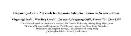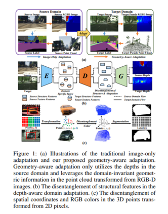 度量和缓解合成(源)数据与真实场景(目标)数据之间的差异是领域自适应语义分割的核心问题。近年来,已有工作通过在源域引入深度信息来增强几何和语义知识迁移,但仅基于二维估计深度无法提取物体的位置和形状等内在三维信息。本文提出一种新的几何感知域适应网络(GANDA),利用更紧凑的3D几何点云表示来缩小域差距。首先,利用源域的辅助深度监督获取目标域的深度预测,实现结构-纹理解缠;除了深度估计,显式利用RGB-D图像生成的点云上的3D拓扑结构,以进一步在目标域中进行坐标颜色解缠和伪标签细化。此外,为了改进目标域上的二维分类器,我们进行了源域到目标域的域不变几何自适应,统一了两个域上的二维语义和三维几何分割结果。请注意,我们的GANDA在任何现有UDA框架中都是即插即用的。定性和定量的实验结果表明,该模型在GTA5→Cityscapes和SYNTHIA→Cityscapes数据集上的性能均优于目前的先进水平。