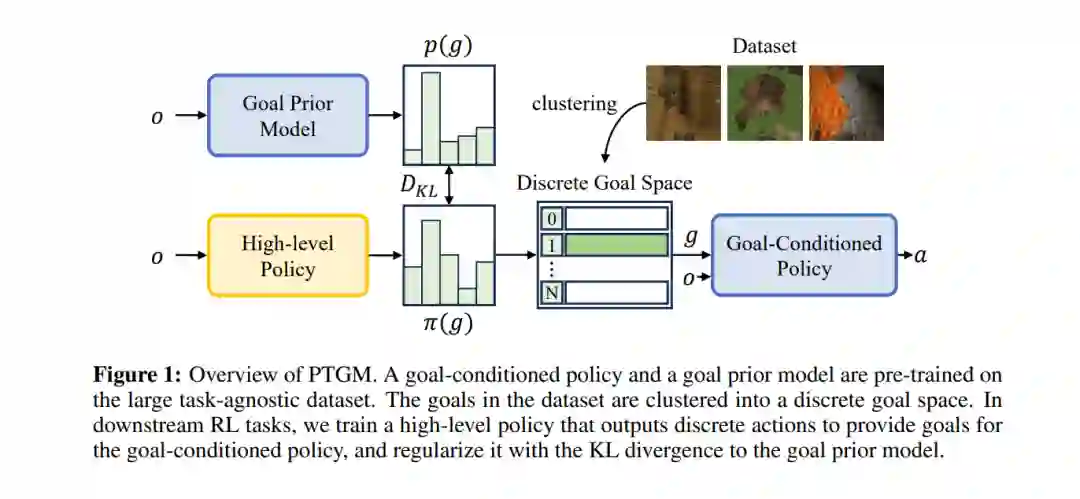 在任务不可知的大型数据集上进行预训练是提高强化学习(RL)在解决复杂任务时样本效率的一种有前景的方法。我们提出了一种名为PTGM的新方法,该方法通过预训练基于目标的模型来增强RL,提供时间抽象和行为规范化。PTGM包括预训练一个低级别、以目标为条件的策略,并训练一个高级别策略为后续RL任务生成目标。为了应对高维目标空间所带来的挑战,同时保持智能体完成各种技能的能力,我们提出了在数据集中对目标进行聚类,形成一个离散的高级别动作空间。此外,我们引入了一个预训练的目标先验模型,以规范化RL中高级别策略的行为,提高样本效率和学习稳定性。在机器人仿真环境和具有挑战性的Minecraft开放世界环境中的实验结果表明,与基线相比,PTGM在样本效率和任务性能方面具有优势。此外,PTGM在获取的低级技能的可解释性和泛化性方面展示了增强的效果。