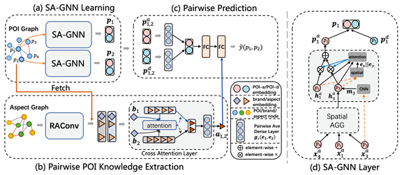 兴趣点(Point of interest, POI)竞争关系可以衡量城市中两个POI(如餐馆、酒店、游乐场等)为了争取足够多的资源(主要是用户)而产生的竞争的强弱。已有的竞争关系分析的研究主要聚焦于从文本数据中挖掘企业或者商品等实体之间的竞争行为,而很少关注POI之间的竞争关系分析。大量关于POI的用户行为数据(如评论数据和地图搜索数据)的出现为POI的竞争关系分析提供了可能。 论文中,百度首先使用POI评论和地图搜索数据构建了一个异构的POI信息网络(HPIN)。同时,百度提出一种基于图神经网络的深度学习框架DeepR。该框架由空间自适应图神经网络(SA-GNN)和POI知识抽取模型(PKE)两个部分组成。SA-GNN具有面向空间的聚合操作和基于空间依赖的注意力机制等特殊结构,可以有效结合POI的空间信息和位置分布对POI的表征进行学习。同时,PKE利用关系图卷积计算和交叉注意力网络提取HPIN中的有关POI的知识特征。在两个真实数据集上的实验结果证明了DeepR的有效性。